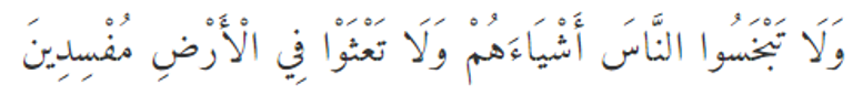 Artinya: Dan janganlah kamu merugikan manusia pada hak-haknya dan janganlah kamu merajalela di muka bumi dengan membuat kerusakan.