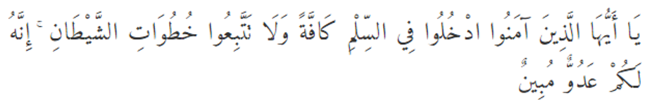 Artinya: Hai orang-orang yang beriman, masuklah kamu ke dalam Islam keseluruhan, dan janganlah kamu turut langkah-langkah syaitan. Sesungguhnya syaitan itu musuh yang nyata bagimu.